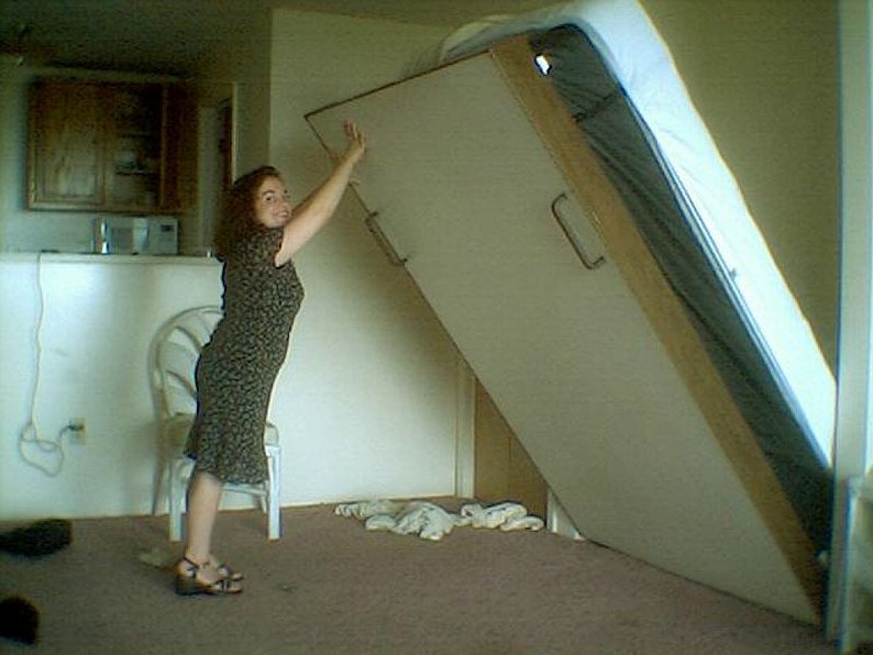 A Murphy Bed is a movable bed that can be hidden away in a cabinet case or on a wall implement. It can be lowered to the floor when it is going to be used and after which, it can also be neatly tucked into its cabinet or on the wall. Oftentimes, the case or cabinet that the bed goes into is also functional and has aesthetic qualities to hide the bed. Thus, if the bed is upright, no one would suspect that it is a bed until it gets lowered for use. It can be quite a conversation starter too! As such, a Murphy bed has also taken on other names like a hidden bed, a secret bed, a pull-out bed, or a wall-bed. Nevertheless, it still has to function well as a bed regardless of the mechanisms applied to it, and this are of course the concerns on the weight of the bed, the mattress and whether it can be lowered or pulled out by one person and whether there is an automatic button that you could push so the bed would lower on its own. The funny thing is that all of these contraptions have already been made, and it has not changed the bed at all, but it indeed impacted the cost, the structure, and the materials used to make the bed, the design had always remained the same. With the addition of hinges, hydraulics, and automatic lowering functions, the Murphy Bed became so expensive that the price tag would be enough to make people think twice about it. If you are to spend that amount of money on a disappearing bed, then you might just as get a high-end bed for your bedroom. Fortunately, other manufacturers have found a solution to make Murphy beds cost a lot less than the automatic ones, but without the special mechanisms, it also meant that lowering and putting the bed up on the wall cannot be done by one person alone, as it would be dangerous to do so. The weight of the bed, its frame, and the full-sized mattress would break anyone’s back, thus for safety purposes, it should always be done by at least two people.